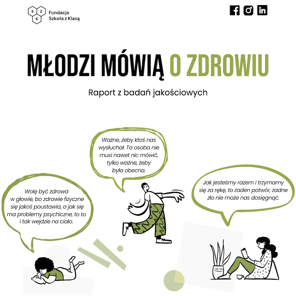 „Młodzi mówią o zdrowiu” to raport, który jako pierwszy w Polsce prezentuje temat zdrowia wyłącznie z perspektywy młodego pokolenia. Dzięki pogłębionym rozmowom z uczniami i uczennicami w wieku 11-17 lat udało się pokazać ich postrzeganie zdrowia, potrzeb z nim związanych i wyzwań, z jakimi mierzą się na co dzień. Badanie zostało zrealizowane przez Fundację Szkoła z Klasą w ramach programu edukacyjnego „Zdrowie z Klasą”. Zebrane wnioski posłużą do zaprojektowania działań w szkołach w kolejnej edycji programu, którego celem jest wzmacnianie kompetencji zdrowotnych nie tylko uczniów, ale i całych społeczności szkolnych.