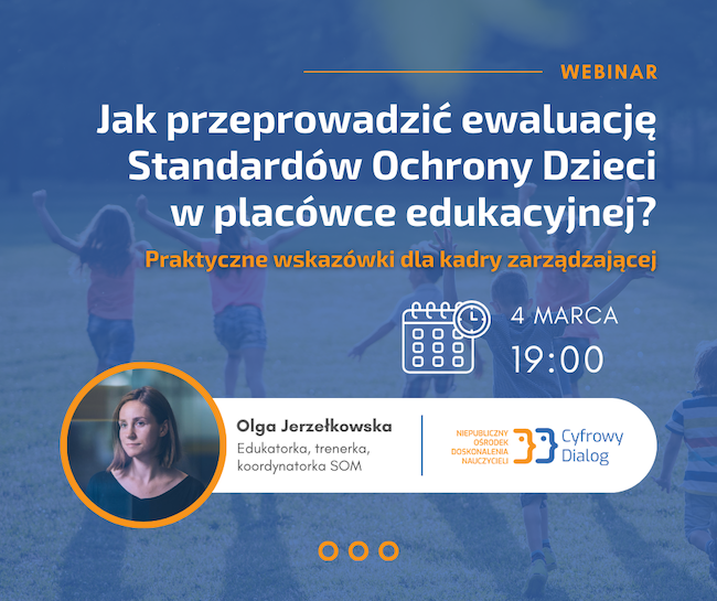 O dobrych praktykach monitoringu i ewaluacji SOM, najczęstszych wyzwaniach oraz o tym, co zmieniło się w ciągu ostatnich dwóch lat, rozmawiamy z Olgą Jerzełkowską – edukatorką, trenerką i koordynatorką Standardów Ochrony Dzieci w Stowarzyszeniu Cyfrowy Dialog, która już 4 marca poprowadzi na ten temat bezpłatne szkolenie dla kadry zarządzającej placówek edukacyjnych.