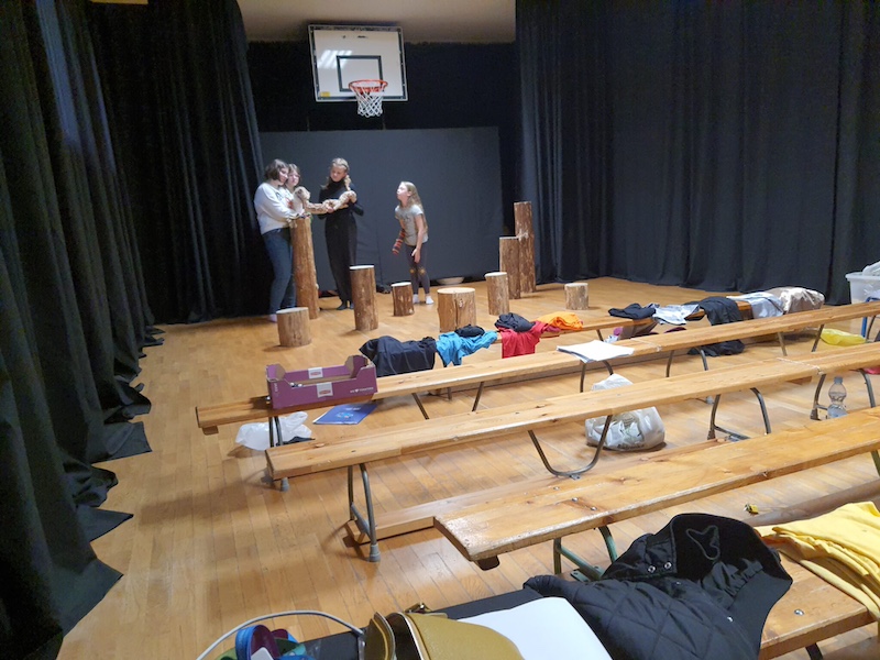 Samym przygotowaniem sali - ustawienie scenografii, rekwizytów, świateł zajmujemy się na 2 dni przed występem. Wynika to z tego, że wcześniej na sali odbywają się zajęcia wychowania fizycznego i nie mamy możliwości rozłożenia wszystkiego wcześniej. Oczywiście w trakcie naszych prób pewne elementy scenografii ustawiamy, ale jednak nie całość, bo organizacyjnie i czasowo byłoby to trudne do wykonania-ciągłe montowanie i demontaż. Ustawianie niektórych elementów scenografii podczas prób to zadanie nie tylko moje, ale i całego zespołu. Nie zawsze wszyscy mają ochotę pomagać i próbują się szybko “wyślizgnąć” po próbie, dlatego zwykle rozdzielam zadania-kto za co odpowiada.