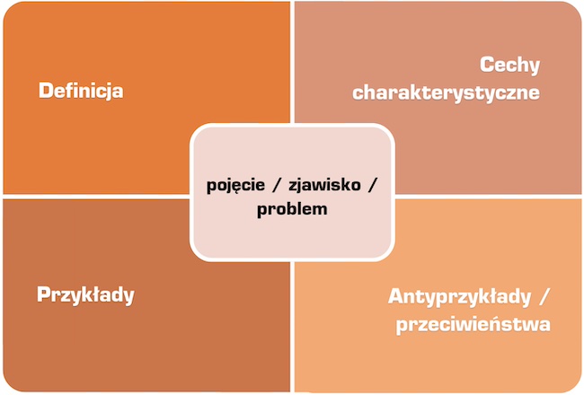 Uogólnianie, szukanie prawidłowości i schematów jest dla uczniów zazwyczaj skomplikowane i wymaga ogromu wysiłku. Pomocne w tym przypadku mogą być takie techniki, jak: Przykład na…; Łączenie faktów; Połącz pojęcia; Docieranie do pojęcia itd. Największą trudność stanowi jednak tworzenie definicji: uczniowie nie wiedzą, jak tworzyć precyzyjne i przemyślane definicje, dlatego z reguły ograniczają się do kilku wyrazów. Mapa definicji pojęć jest świetną okazją, by tę umiejętność wyćwiczyć. Narzędzie jest schematem graficznym, na którym osoby uczące się umieszczają:
