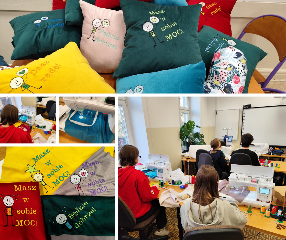 To miejsce, z którego uczniowie korzystają zarówno w trakcie przerw, jak i w ramach zajęć dodatkowych. Mogą tworzyć własne projekty – od haftowanych breloków, personalizowanych toreb i ozdabiania ubrań, po realizację autorskich pomysłów. Angażują się także społecznie, biorąc udział w licznych akcjach pomocy: szyją poduszki dla pacjentek onkologicznych i pacjentów pobliskiego szpitala. Dzięki temu mają szansę doświadczyć namacalnych efektów swojej pracy, a czasem nawet zobaczyć uśmiech osób, którym w trudnym okresie sprawili odrobinę radości. To szczególne poczucie sensu i jasnego celu staje się impulsem do nauki – młodzi ludzie widzą, że dzięki zdobytym umiejętnościom mogą realnie pomagać innym. Chętnie wspierają swoim rękodziełem kiermasze charytatywne, a gdy przychodzi pora na „Noc w Rękodzielni” albo wizyta w szkole w wakacje, nikt nie musi ich do tego namawiać.