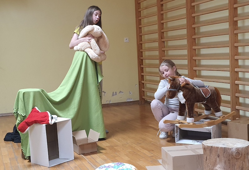 Mając już pewne wyobrażenie o spektaklu myślę o kostiumach i rekwizytach. Choć o tym myślę już na etapie pisania scenariusza. Jednak wiele jeszcze się rozjaśnia w chwili, kiedy zaczynamy próby. Powstają pierwsze prototypy. Więcej na ten temat znajdziecie tutaj . Sporo w samym przygotowaniu pomagają uczniowie oraz rodzice. Czas przeznaczony na przygotowanie scenografii i rekwizytów to ok. 8-10 godzin. Do tego osobno należy doliczyć należy czas rodziców na przygotowanie scenografii i rekwizytów.